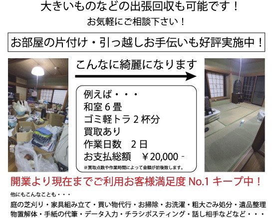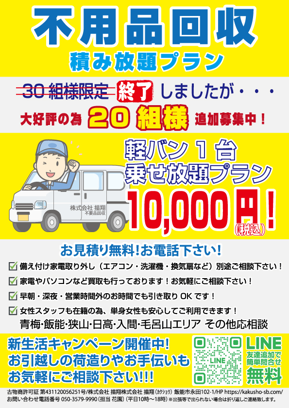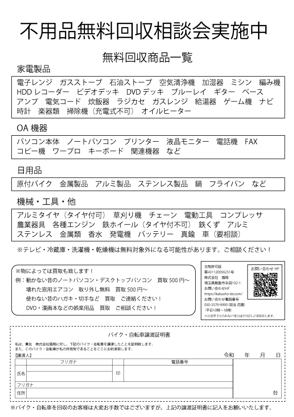 さらには、埼玉県公安委員会より古物商許可証を受けているため、処分にお困りの家具や家電等の不要品を無料回収、物によっては買取も承っております。